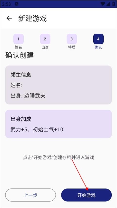 2、你可以选择你的出身,如边陲武夫、士族子弟、商贾后人、落难宗室等,每个出身都有不同的属性和资源;