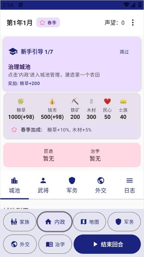 4、先完成新手引导建造农田,稳定粮草基础收入,避免前期征兵导致资源枯竭;
