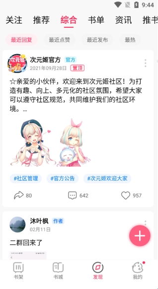 3、发现板块也就是社区板块,可以根据其他用户的推荐进行阅读或是分享交流自己的阅读心得体验;