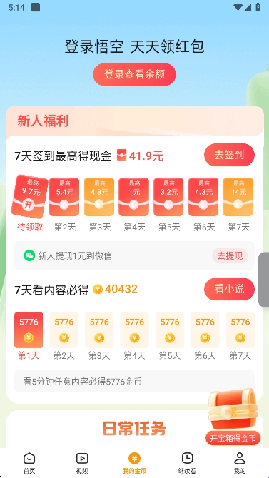 打开悟空浏览器后,登录账号,点击底部中间的“我的金币”,并点击“领取金币”;